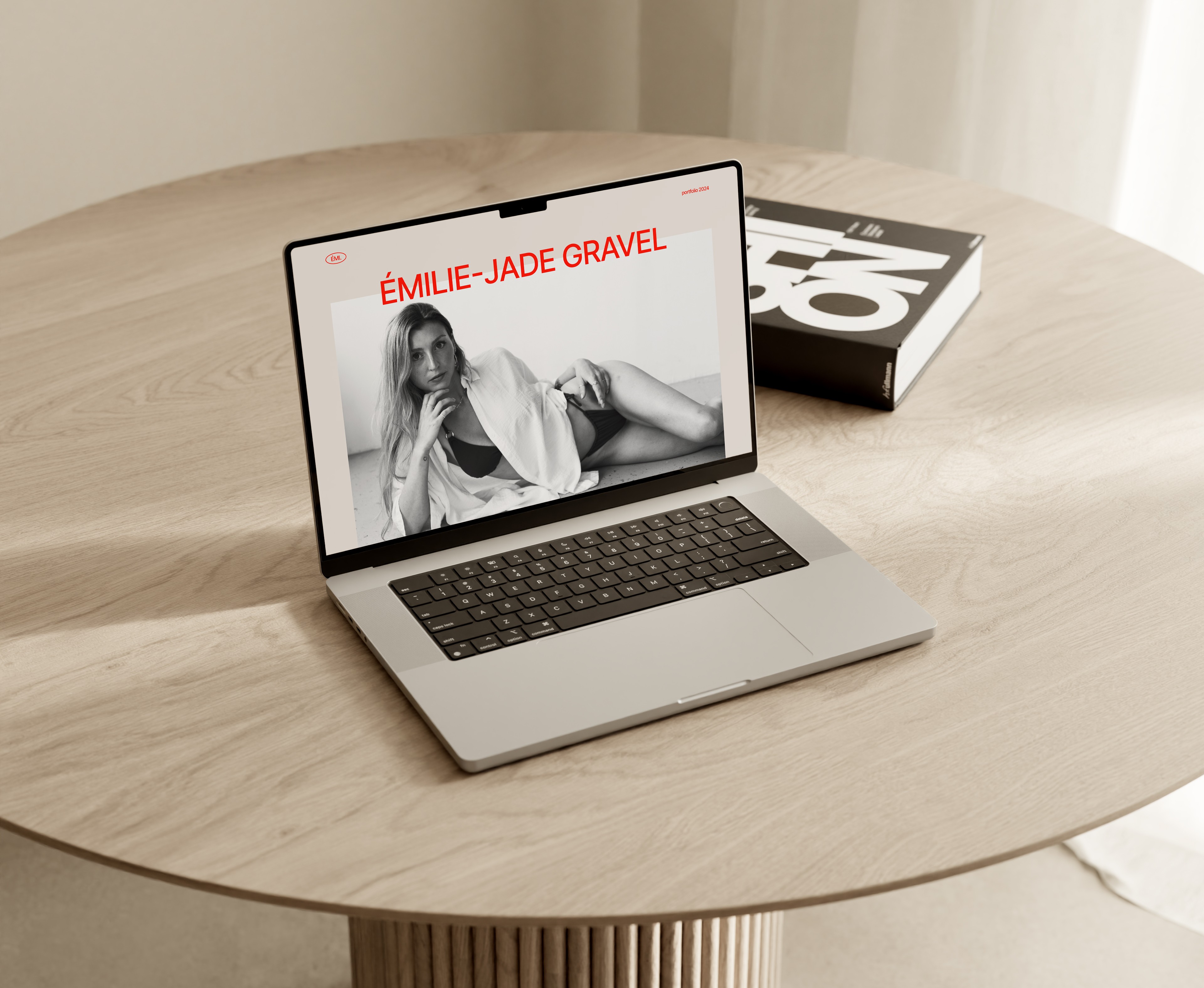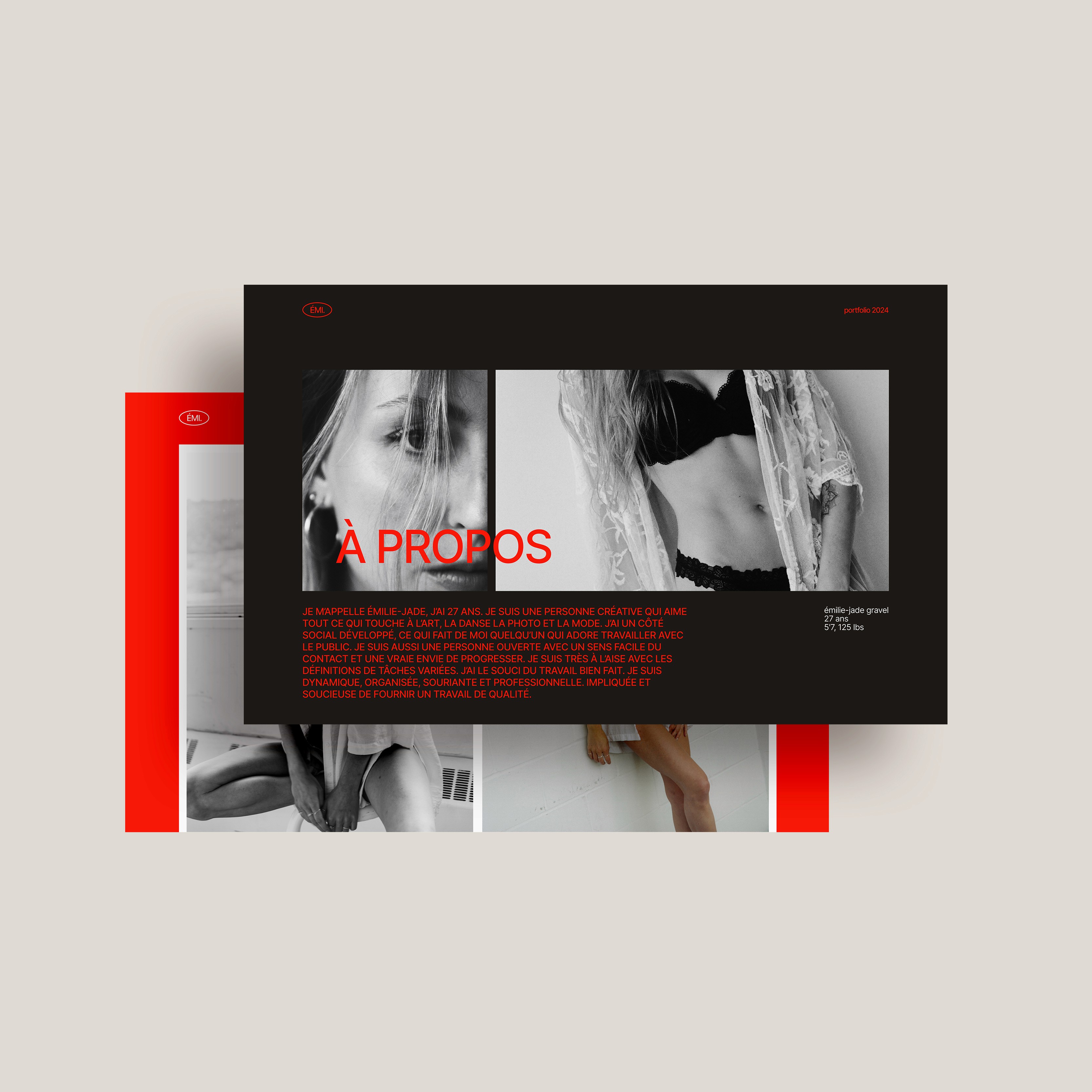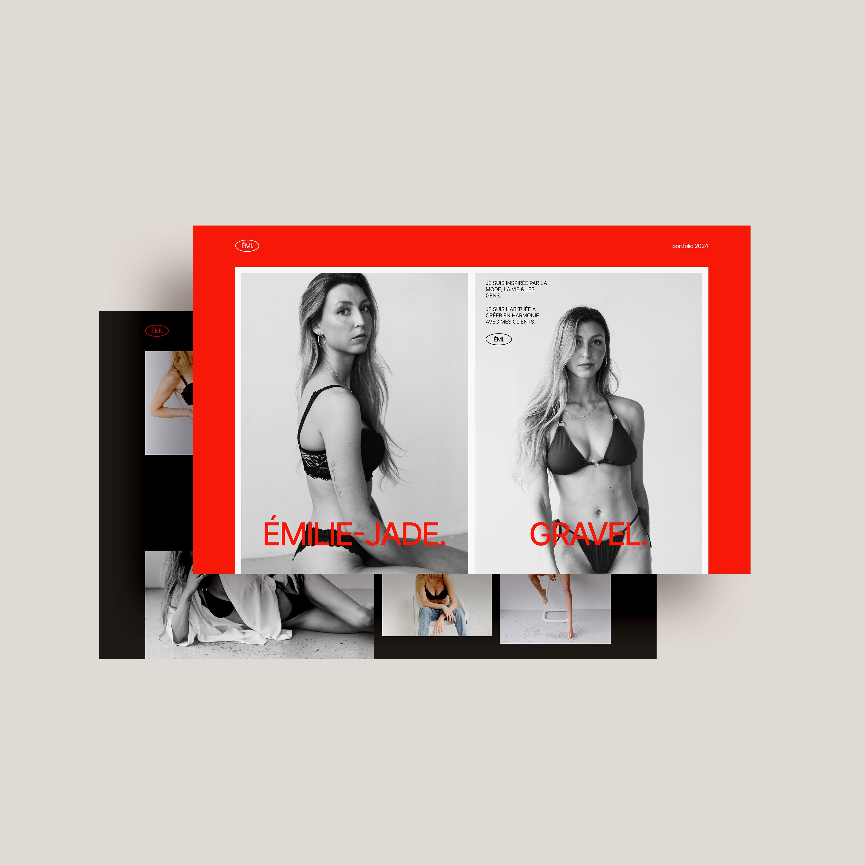 For Émilie-Jade Gravel’s portfolio, I designed a sleek and elegant identity that captures her bold and expressive presence. The minimalist layout with large-scale typography creates a striking visual impact, while the use of red adds a sense of energy and confidence. The black-and-white photography emphasizes her natural beauty and raw emotion. This refined portfolio design highlights Émilie-Jade’s artistic versatility with a clean and sophisticated aesthetic.