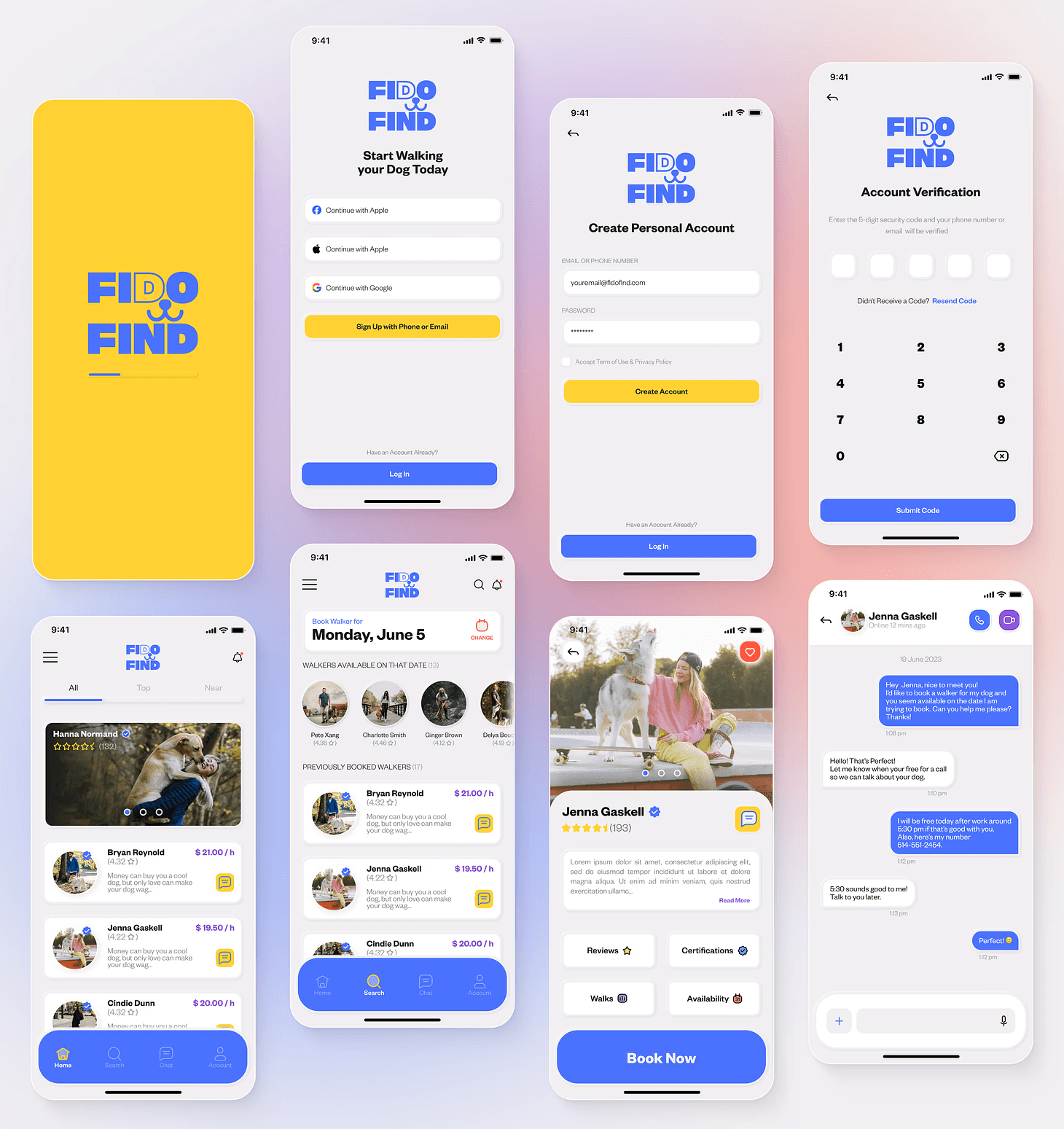 Introducing "FIDO FIND," a dog-walking app thoughtfully designed for busy dog owners who are often away from home. This mobile app concept offers a convenient solution to address the needs and concerns of pet owners. I was responsible for every aspect of this project, including logo design, branding, UI/UX, user flow, and more.